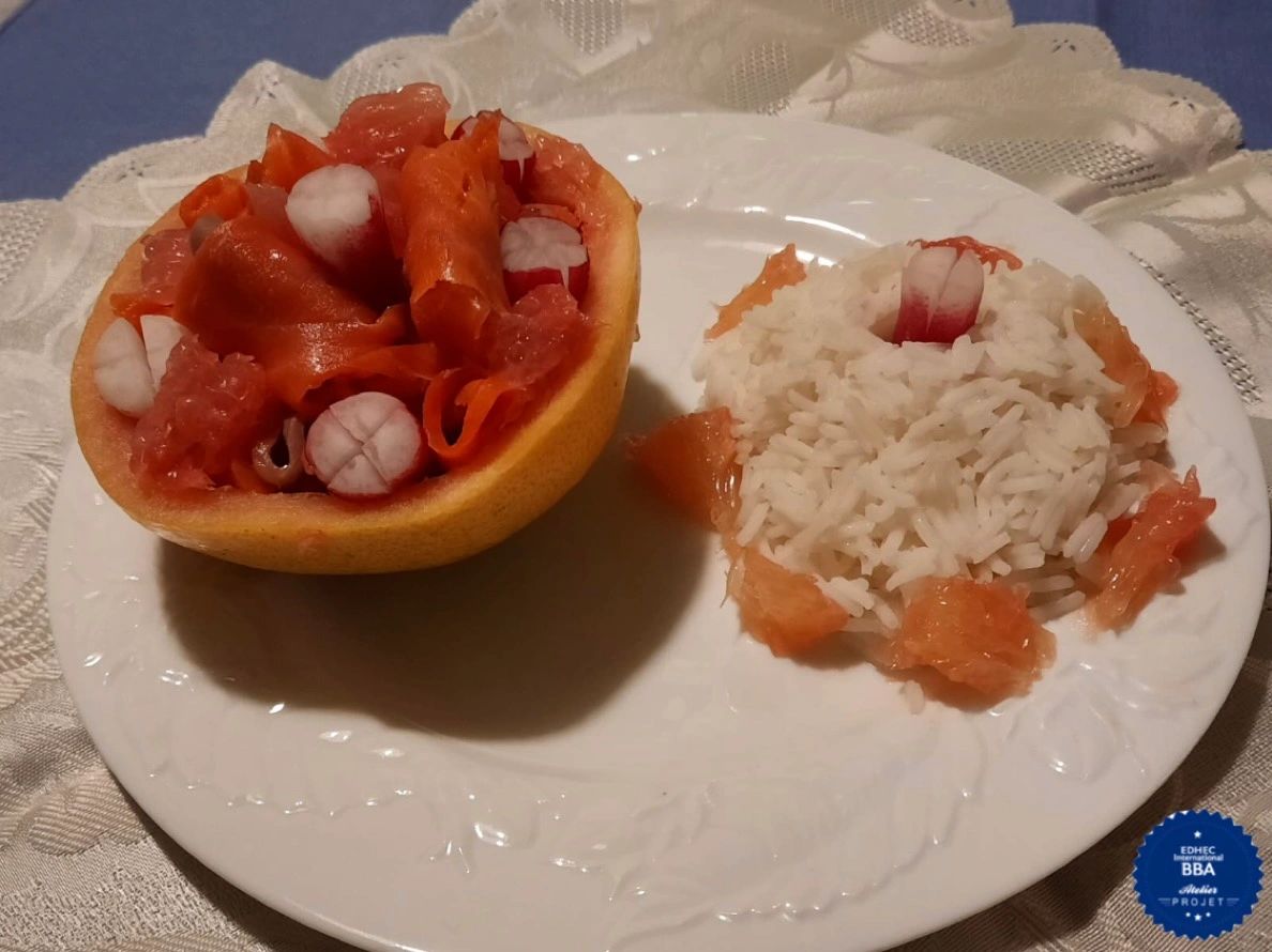 🍴1 demi pamplemousse, garni de radis et de fines lamelles de saumon fumé / accompagné de riz 🍚